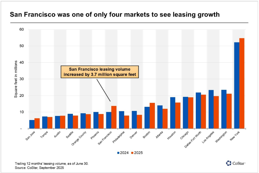 AIの台頭で、米国の主要都市ではオフィス市場が活発化しています。特にAI産業の最前線にあるサンフランシスコやシリコンバレーでは、GoogleやLinkedIn、Databricks、AnthropicなどのAI関連企業が大規模なオフィス契約を結び、市場全体の賃貸成約数を押し上げています。商業不動産情報サービス会社のCoStarによると、サンフランシスコの年間オフィスリースの増加量は2025年6月時点で370万平方フィートに達し、全米最大を記録しました。数年間の低迷を経て、テクノロジー産業が再びオフィス市場を牽引する主役となっています。