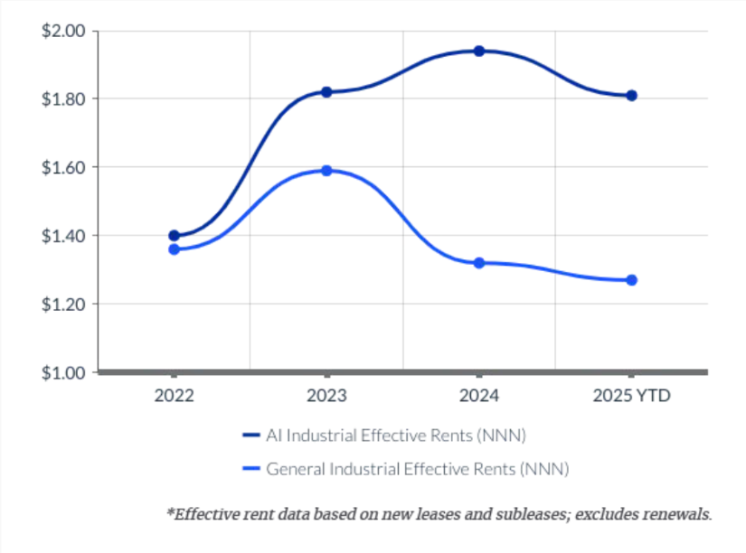 AI関連インフラを支えるインダストリアル市場でも需要が急増しており、その勢いはオフィス市場を超えて活況を呈しています。商業用不動産コンサルティングサービス会社のColliersによると、シリコンバレーでは2025年7月時点で、AI企業が契約したインダストリアルスペースは982,000平方フィートに上りました。これは2024年同期比で約102%増、かつ2024年通年で契約された実績をも上回りました。